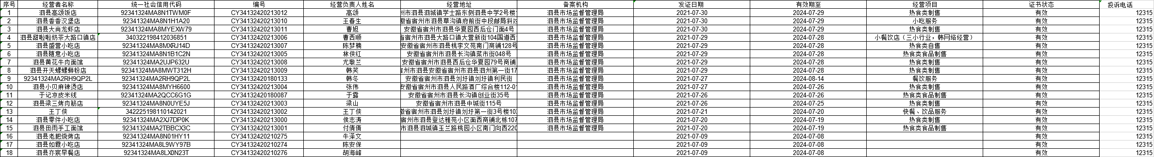 泗县市场监督管理局小餐饮、摊贩备案信息公示(五期)