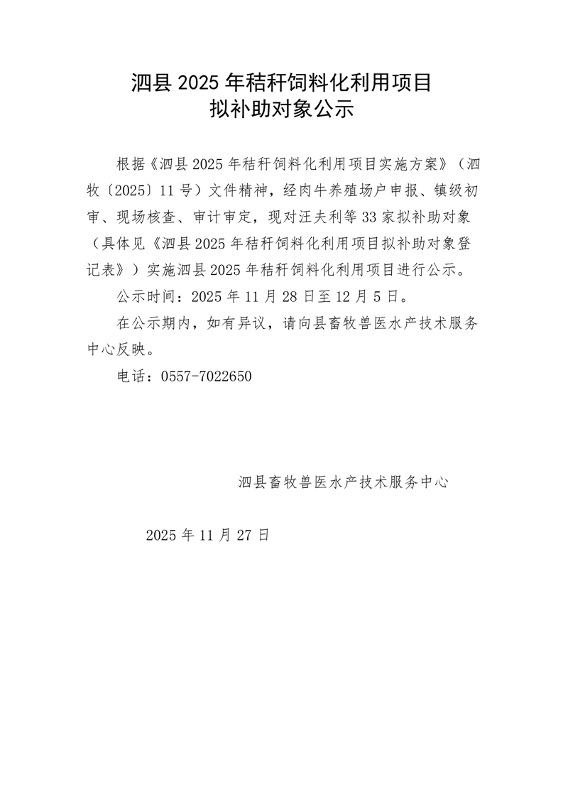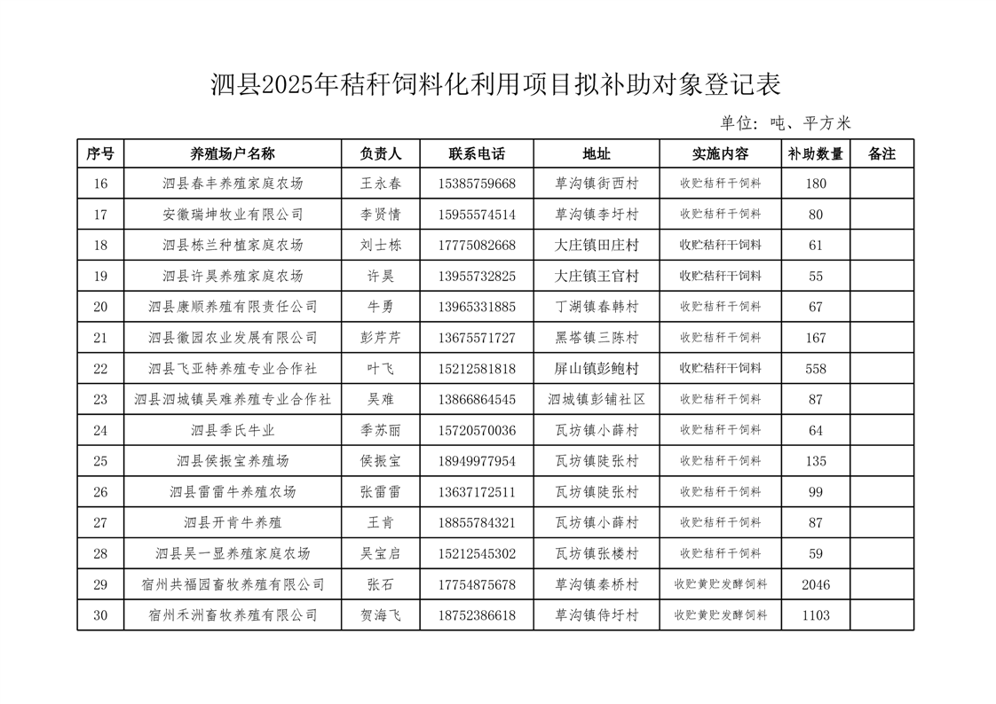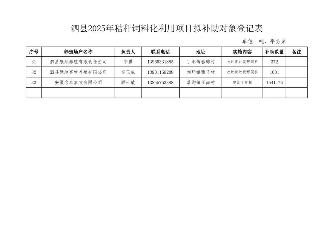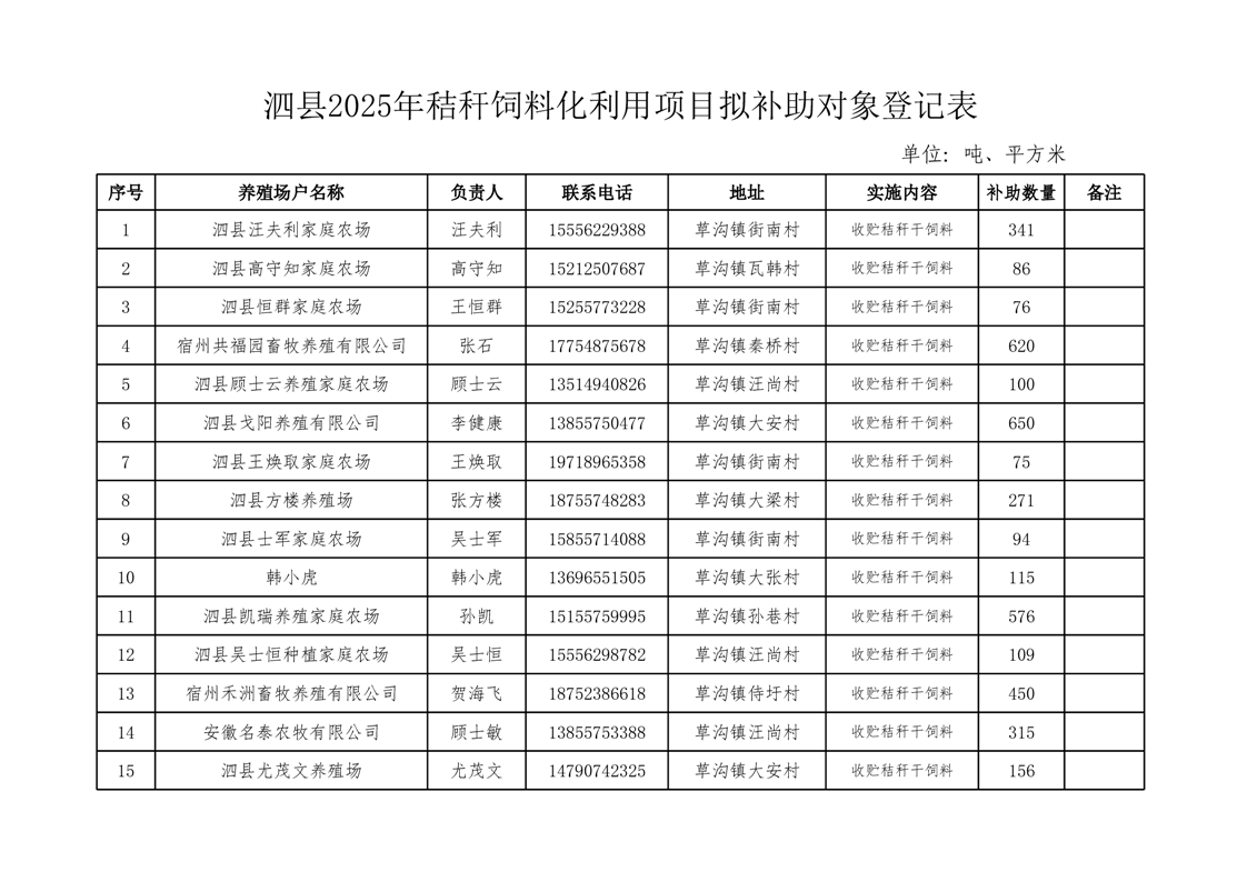 【补贴结果】泗县2025年秸秆饲料化利用项目拟补助对象登记表