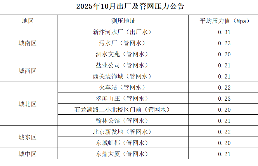2025年10月出厂及管网压力公告