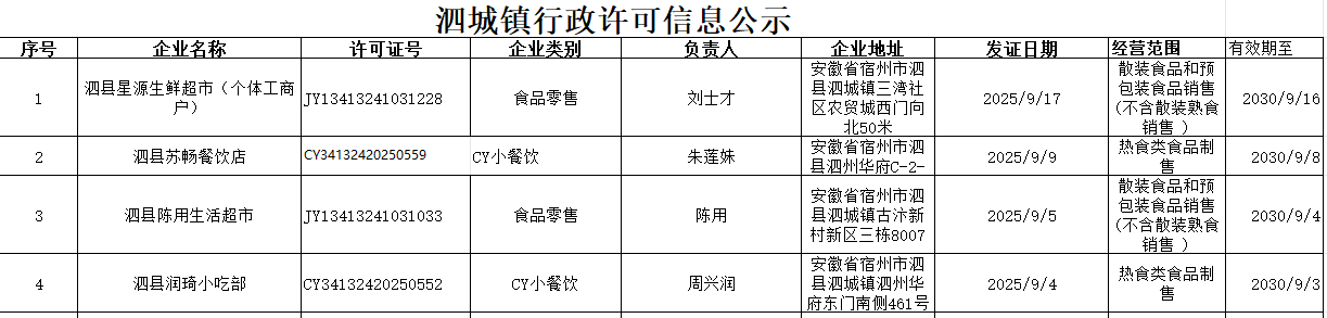 泗城镇2025年9月份小餐饮、食品摊贩备案基本信息