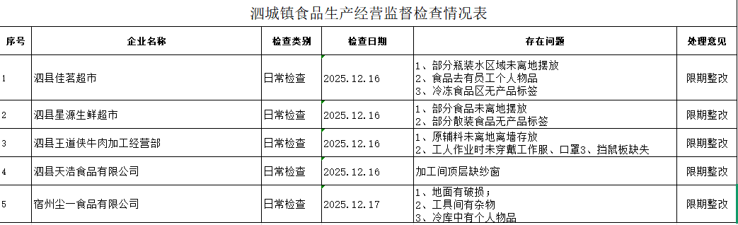 【检查结果】泗城镇2025年12月份食品生产经营监督检查情况表