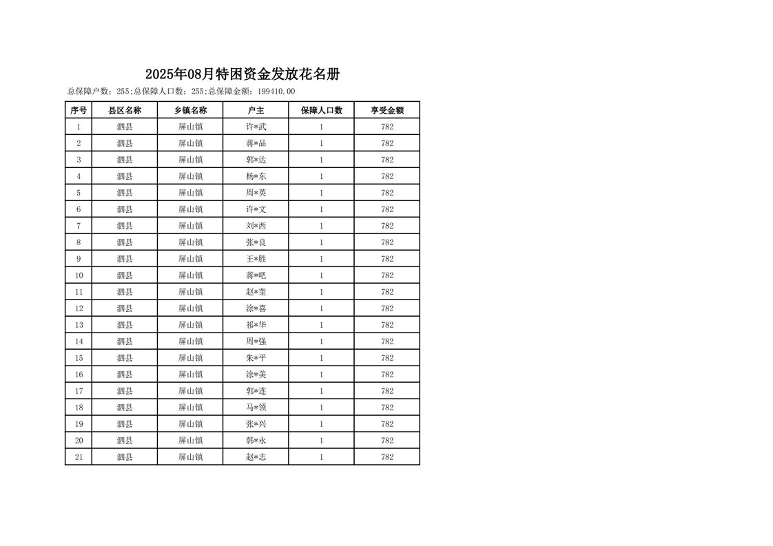 【分配结果】屏山镇2025年8月份特困人员救助供养资金发放花名册