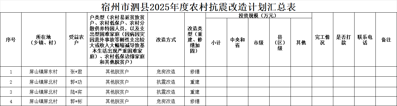 泗县屏山镇2025年度农村抗震改造计划汇总表
