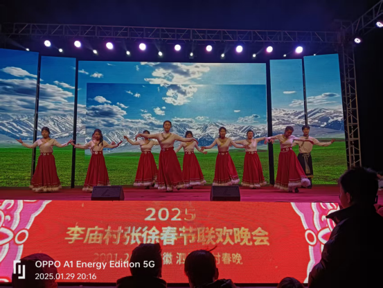 1月29日晚,李庙村张徐春节联欢晚会热闹开演,这场由村民自编自导自演的“村晚”,让浓浓的年味在乡村舞台上弥漫开来。舞台上,身着藏族服饰的舞蹈队员们手拉手翩翩起舞,鲜艳的裙摆与大屏上的草原雪山相映成趣,将民族风情与乡土活力完美融合。台下观众围坐一堂,随着节奏轻轻打拍,欢笑声、叫好声此起彼伏。除了民族舞,晚会还汇集了歌曲、小品、戏曲等多样节目,既有对家乡发展的深情礼赞,也有对新春的美好祈愿,每一个节目都饱含着村民对生活的热爱。