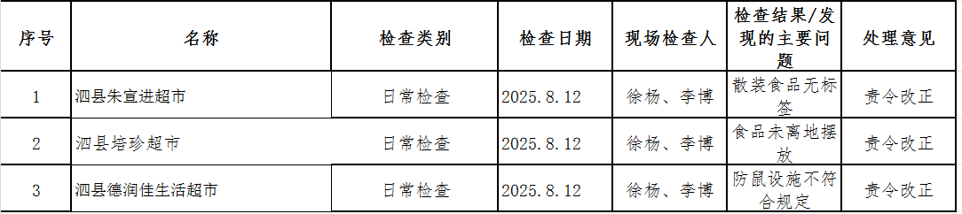 泗县市场监督管理局大杨所食品生产经营监督检查信息公示(2025年第八期)