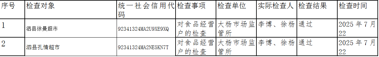 泗县市场监督管理局大杨所食品生产经营监督检查信息公示(2025年第7期)