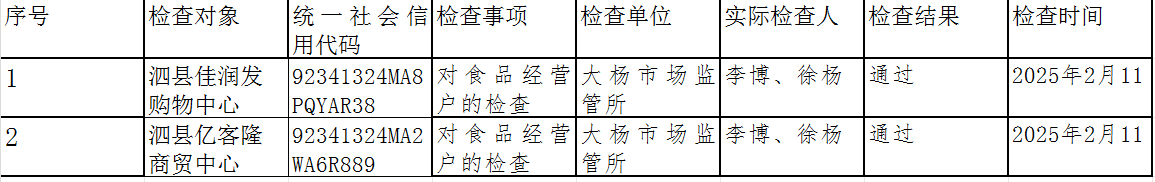 泗县市场监督管理局大杨所食品生产经营监督检查信息公示(2025年第2期)