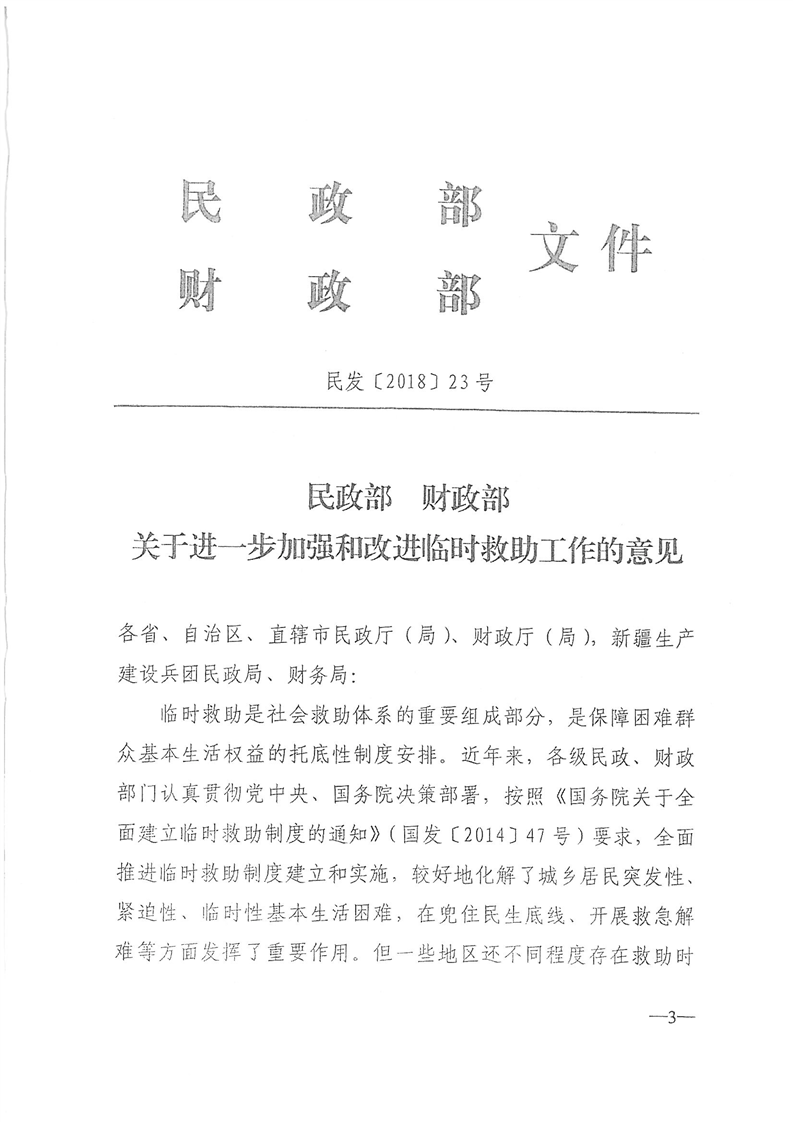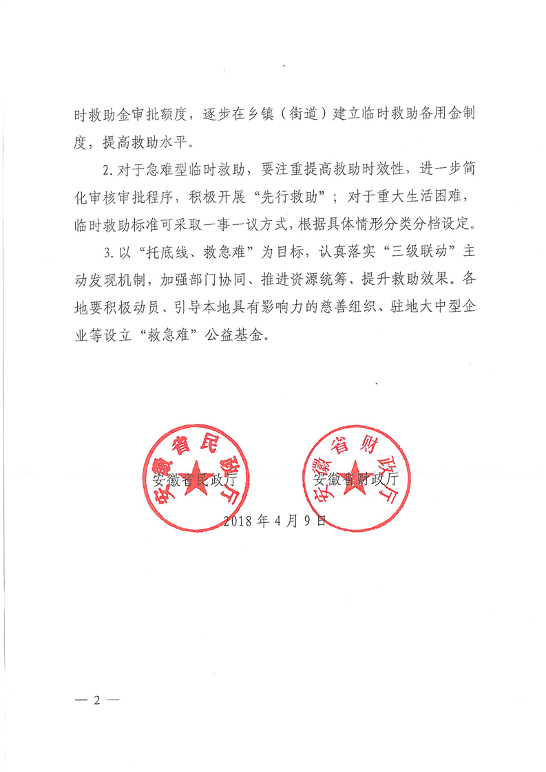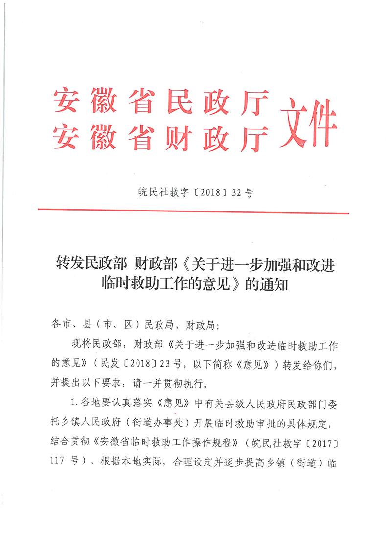 【政策法规文件】安徽省民政厅财政厅转发民政部财政部《关于进一步加强和改进临时救助工作的意见》的通知(皖民社救字〔2018〕32号)