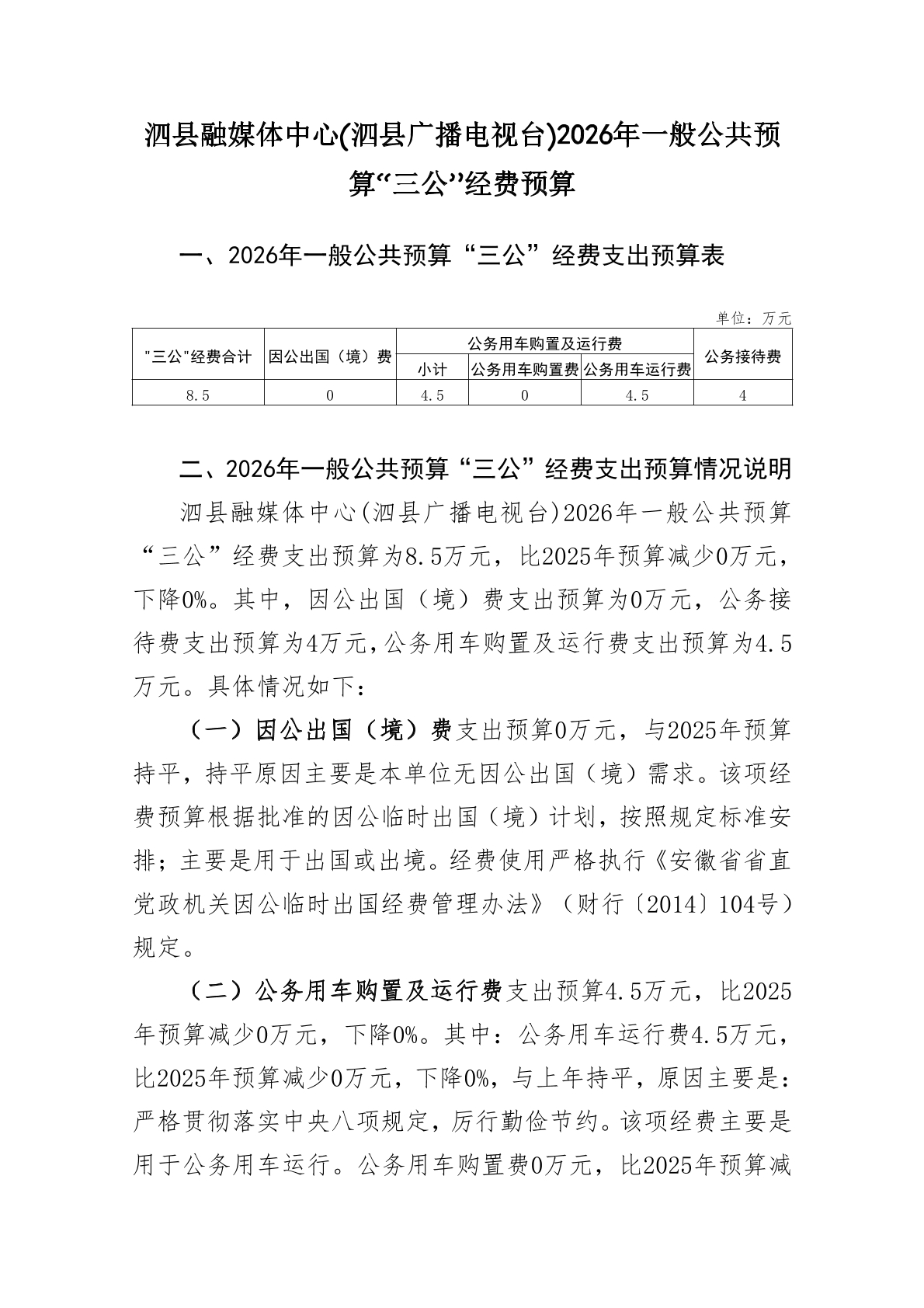 泗县融媒体中心(泗县广播电视台)2026年一般公共预算“三公”经费预算 |