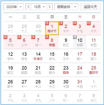 从9月2日起十一黄金周火车票已经正式开售,根据国务院办公厅通知精神2020年国庆节、中秋节放假安排通知如下:10月1日(星期四)至8日(星期四)放假调休,共8天。9月27日(星期日),10月10日(星期六)上班。