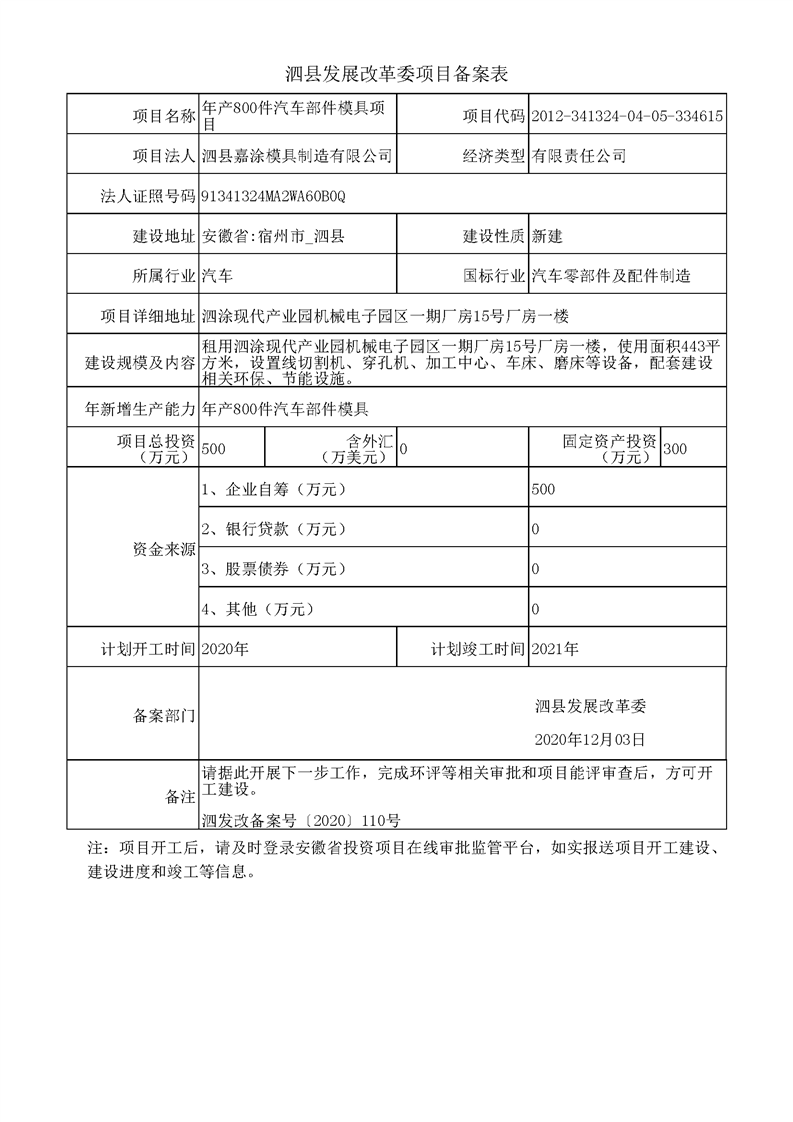 关于年产800件汽车部件模具项目备案表 |