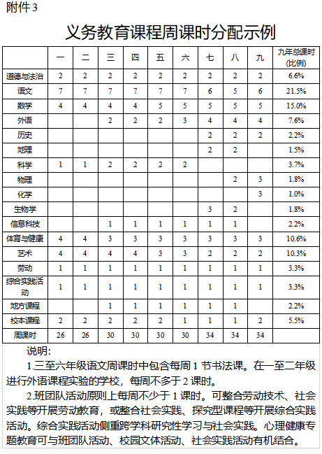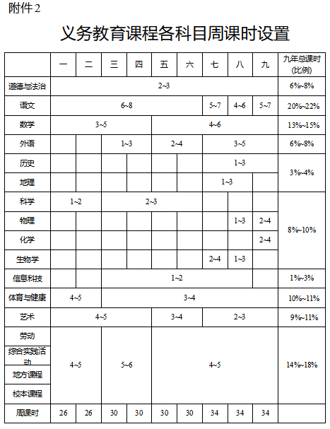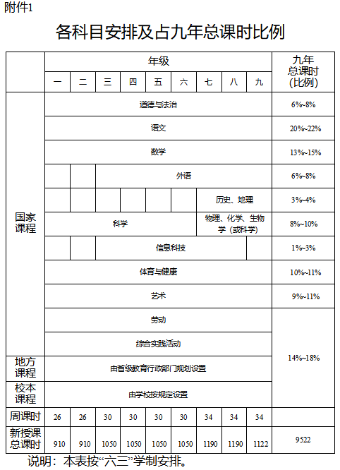 各级教育行政部门和义务教育学校应严格落实国家课程方案要求,开齐开足国家课程,特别是信息科技、体育与健康、艺术、劳动、综合实践活动等课程,不随意增减、占用课时。各科目安排及占九年总课时比例见附件1。劳动、综合实践活动课程自2022年秋季一至九年级开始执行,信息科技课程自2023年秋季三至八年级开始执行,其他学科自2024年秋季一年级、七年级开始执行,确保各科目在相应年级的总课时数达到要求。课程比例设置和周课时分配示例见附件2、附件3。
