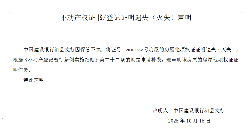 遗失声明:中国建设银行泗县支行申请遗失房屋他项权证证明