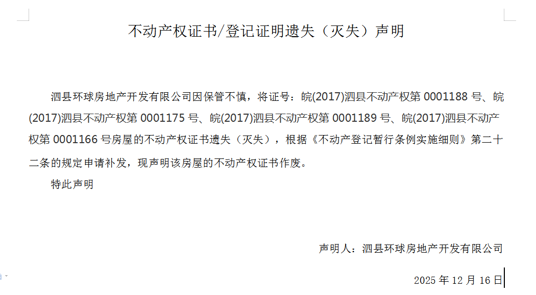 遗失声明:泗县环球房地产开发有限公司申请遗失不动产权证书 |