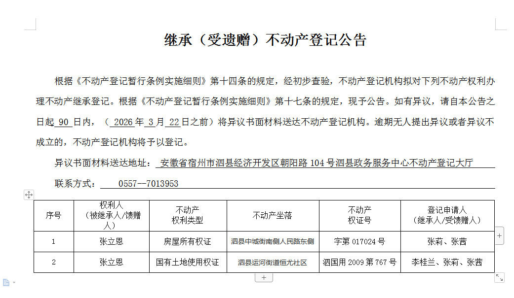 继承(受遗赠)不动产登记公告:李桂兰、张莉、张茜申请继承张立恩的国有土地使用权证和房屋所有权证