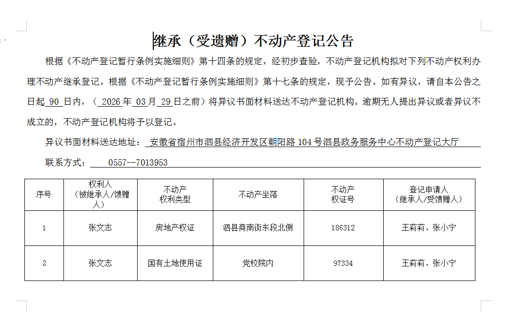 继承(受遗赠)不动产登记公告:王莉莉、张小宁申请继承张文志的国有土地使用权证和房屋所有权证