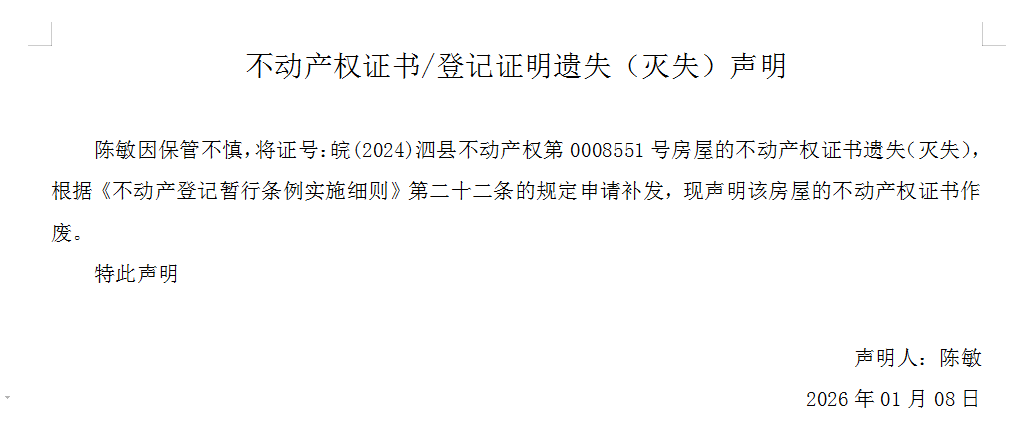 遗失声明:陈敏申请遗失不动产权证书