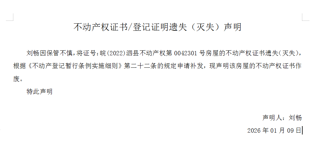 遗失声明:刘畅申请遗失不动产权证书