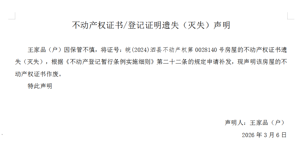 遗失声明:王家品(户)申请遗失不动产权证书 |