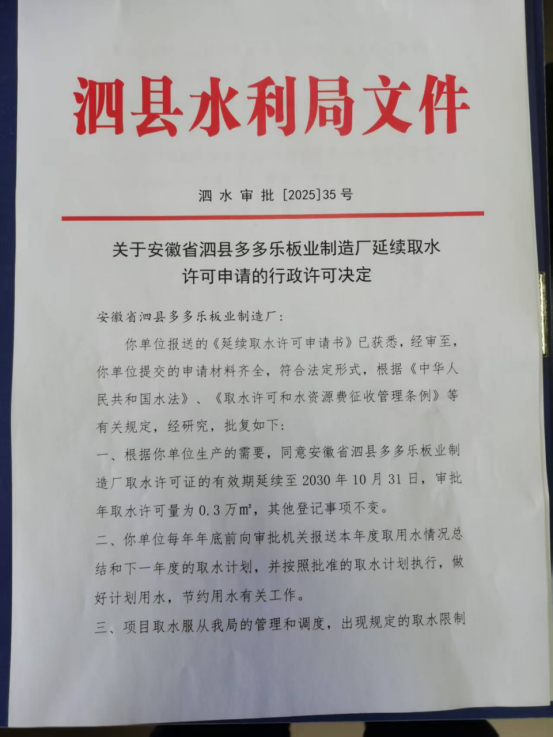 关于安徽省泗县多多乐板业制造厂延续取水许可申请的行政许可决定 |