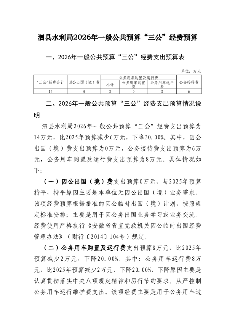 泗县水利局2026年度部门一般公共预算财政拨款“三公”经费预算 |
