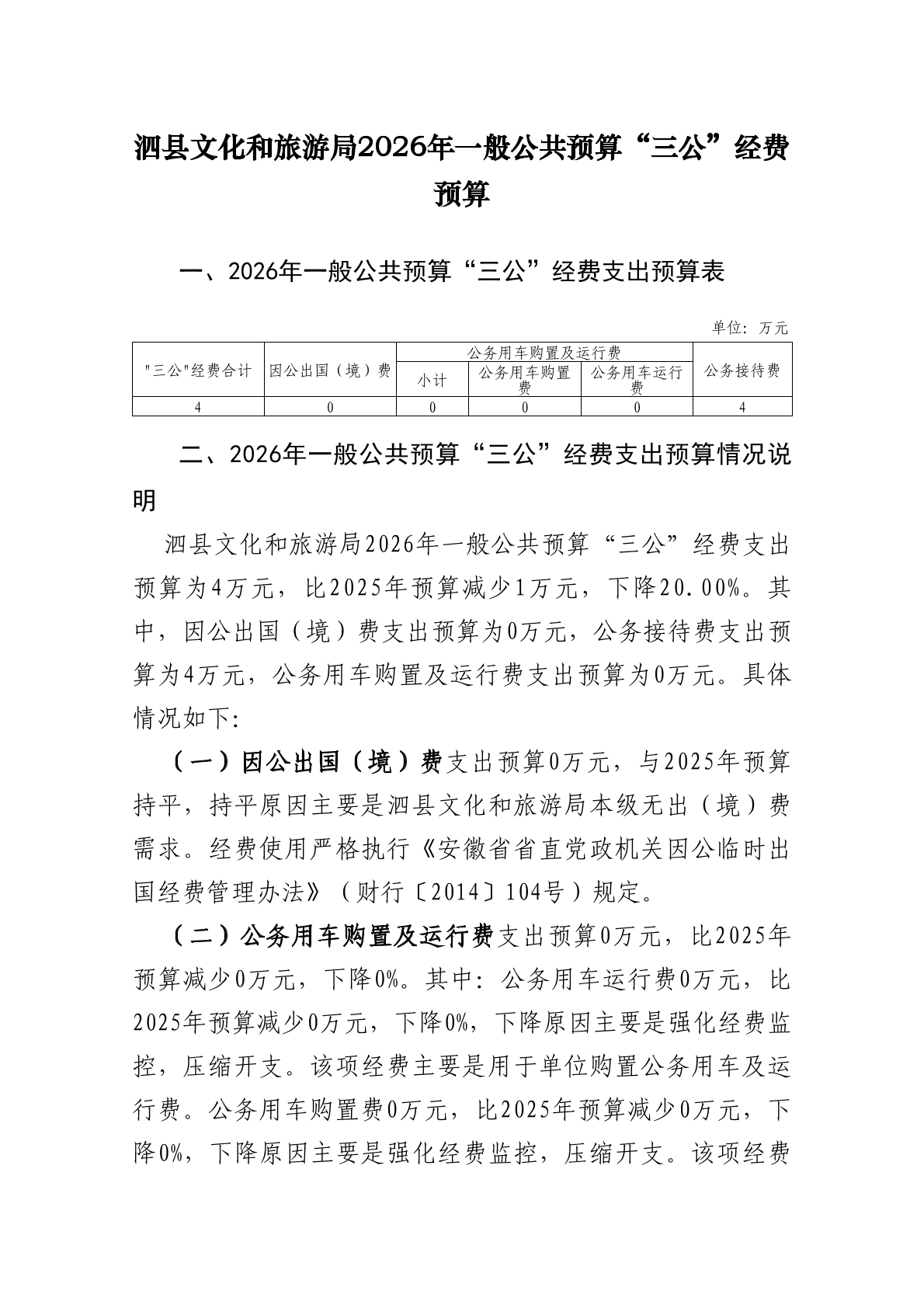 泗县文化和旅游局2026年度单位一般公共预算财政拨款“三公”经费预算情况说明 |