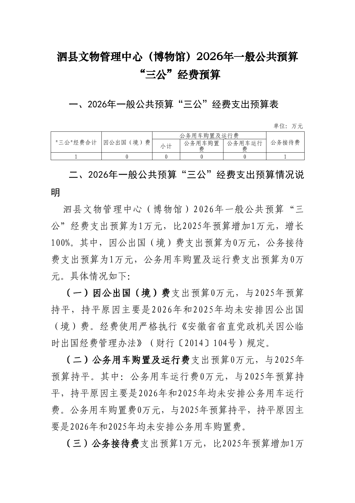 泗县文物管理中心(博物馆)2026年度单位一般公共预算财政拨款“三公”经费预算情况说明 |