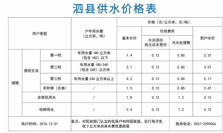 文件依据来源:《关于调整泗县城区自来水价格及实行阶梯水价的通知( 泗价字[2016]24号 )》《安徽省发展改革委关于供水价格有关问题的通知(皖发改价格函〔2024〕415号)》; 从2024年12月1日起,“水资源费”更改为“水资源税相关成本费用”
