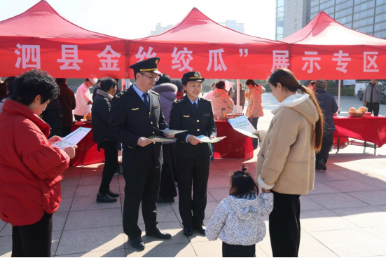 上午九时的府前广场春和景明,草木葱茏。参加活动的执法人员身着制服、整齐列队。社会各界群众面露喜悦,聚拢围观。主席台两侧,8只携带“提升消费品质 畅享舒泗消费”等宣传条幅的氢气球随风摇曳。广场LED显示屏上滚动播放泗县金丝绞瓜、“提升消费品质”2026年3.15主题字幕等画面。
