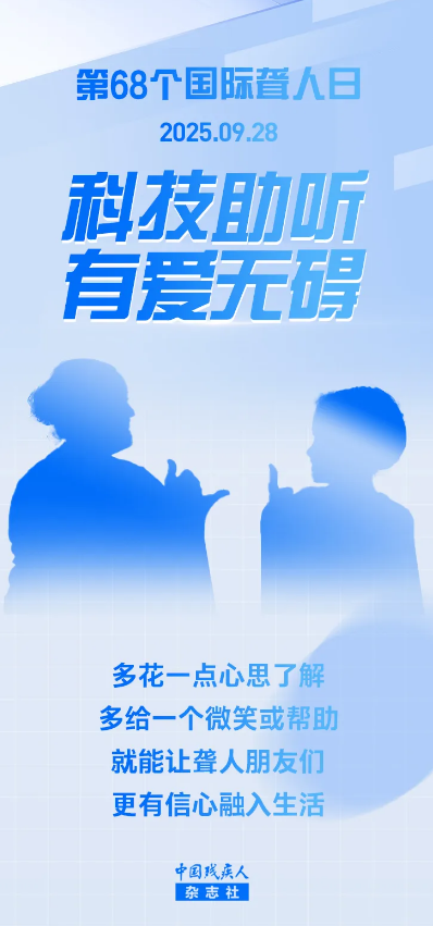 2025年9月28日 是第68个“国际聋人日” 1957年,世界聋人联合会决定 将每年9月的第四个星期日 确定为“国际聋人日” 旨在引起社会对聋人群体的关注 促进聋人平等参与社会生活 推动聋人事业的发展 今年国际聋人日的主题是 “科技助听,有爱无碍” 在这个特殊的日子里 让我们走近聋人朋友 倾听他们的心声 了解他们的需求 共同构筑一个“有爱无碍”的世界 助听器不是“扩音器”! 助听器是“智能翻译机”,能把有用的声音(如说话声)放大,把没用的噪音(如地铁杂音)过滤掉,所以别问“你戴助听器是不是能听见所有声音?”——就像问“你戴眼镜是不是能看见所有东西?”一样,有点可爱但不太对。 聋人朋友的“超能力”! 聋人朋友能用手语“唱”歌(如手语版国歌),能用唇语“听”话(如看对方的嘴唇动作猜内容),甚至能通过震动感受音乐的节拍(如放在音箱上的手,能“摸”到旋律)——聋人朋友的世界,其实有另一种“热闹”。 实时字幕 APP:如 “讯飞听见”,打电话时能实时转文字,还能把文字转语音发给对方,再也不怕 “漏接重要电话”;看视频时打开 “无障碍字幕”,连小声的台词都能看清。 震动提示器:如 “门磁震动器”,有人敲门时会震动提醒。 无障碍社交:很多城市有 “聋人读书会”“手语咖啡屋”,可以帮身边的聋人朋友留意这些活动,多认识同频的人,信心也会更足~ 还有个冷知识:不少聋人朋友的 “视觉感知力” 比健全人强 —— 比如能更快发现路上的小水坑,能记住复杂的路线。 耳机党必看:60—60原则! 音量别超过手机的60%,连续戴耳机别超过60分钟——就算追更再上头,也得让耳朵“歇口气”。 噪音环境:给耳朵“戴口罩”! 装修、演唱会、工地这些地方,要么戴防噪音耳塞,要么赶紧“溜”,别硬扛。 定期“检查耳朵”! 就像每年查视力一样,定期去医院测测听力,尤其是经常戴耳机、接触噪音的人,早发现早“拯救”。 看见听力健康的重要性: 它不是“老年病”,而是我们每个人都该守护的“感官财富”。 看见聋人群体的光芒: 他们能做的,比想象中多得多——比如用手语“对话”的速度,比很多人打字还快;比如通过震动“听”音乐的深情,比很多人更懂旋律。 看见我们能做的“小事”: 比如把耳机音量调小一点,比如与聋人朋友交流时,多一点耐心…… 在国际聋人日这一天里,小编想告诉每一位聋人朋友:你的生活可以有更多可能,有很多人在为 “让你过得更好” 而努力。 也想告诉身边的健全人:多花一点心思了解,多给一个微笑或帮助,就能让聋人朋友们更有信心融入生活。 愿每个生命都能被世界温柔相待!