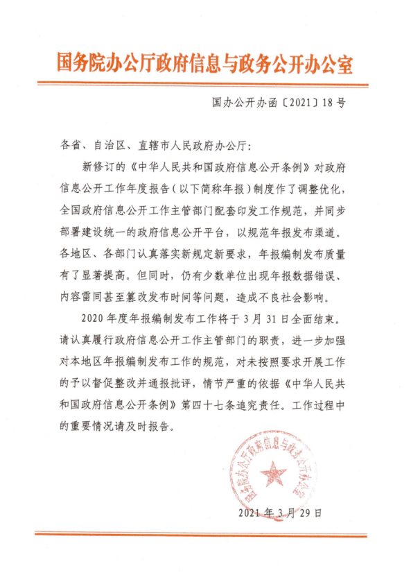 一、各地各部门要对照《国务院办公厅政府信息与政务公开办公室关于政府信息公开工作年度报告有关事项的通知》(国办公开办函〔2019〕60号)的有关要求,从发布及时性、结构全面性、数据准确性和内容是否存在雷同敷衍现象四个方面,迅速开展对2020年政府信息公开工作年度报告(以下简称年报)发布工作的全面排查,各市要重点排查所辖县(市、区)及其部门、乡镇(街道)年报,对发现的问题立即督促整改,切实提高年报发布工作的规范度。