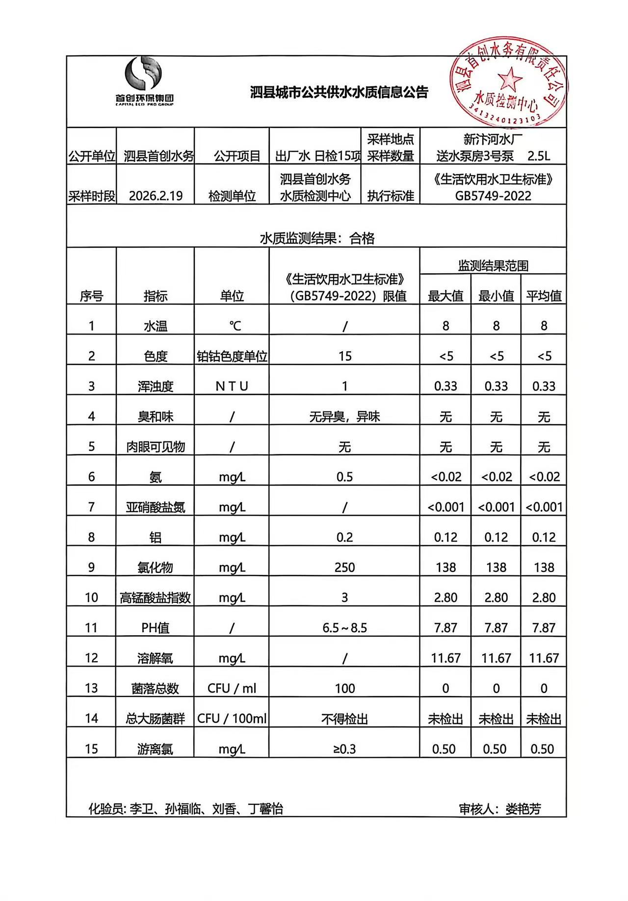 2026年2月19日出厂水水质