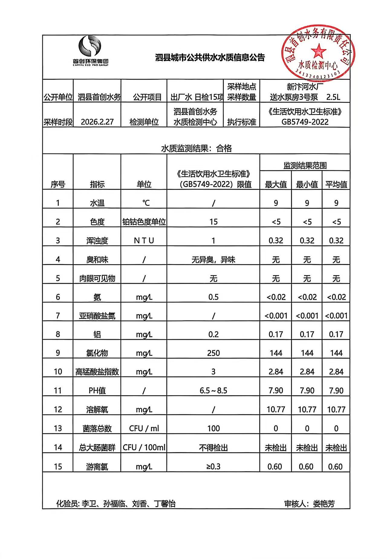 2026年2月27日出厂水水质
