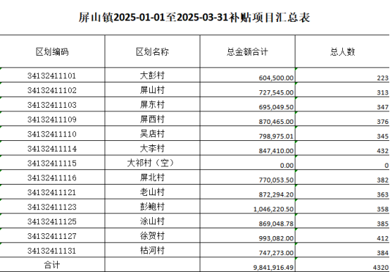 安徽省泗县屏山镇2025年第一季度财政补贴农民资金发放报表