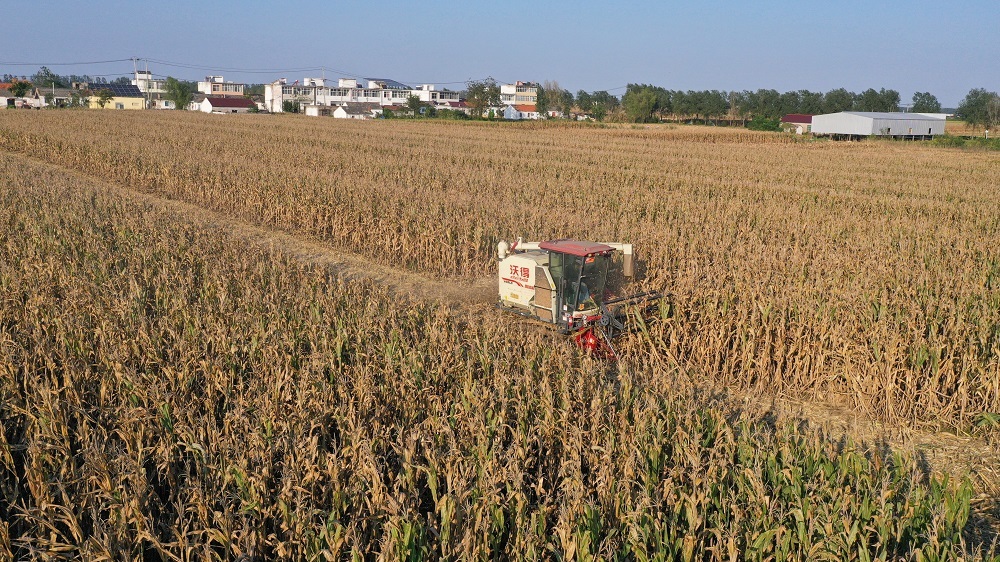 收割机在地里抢收玉米。吴天元 摄