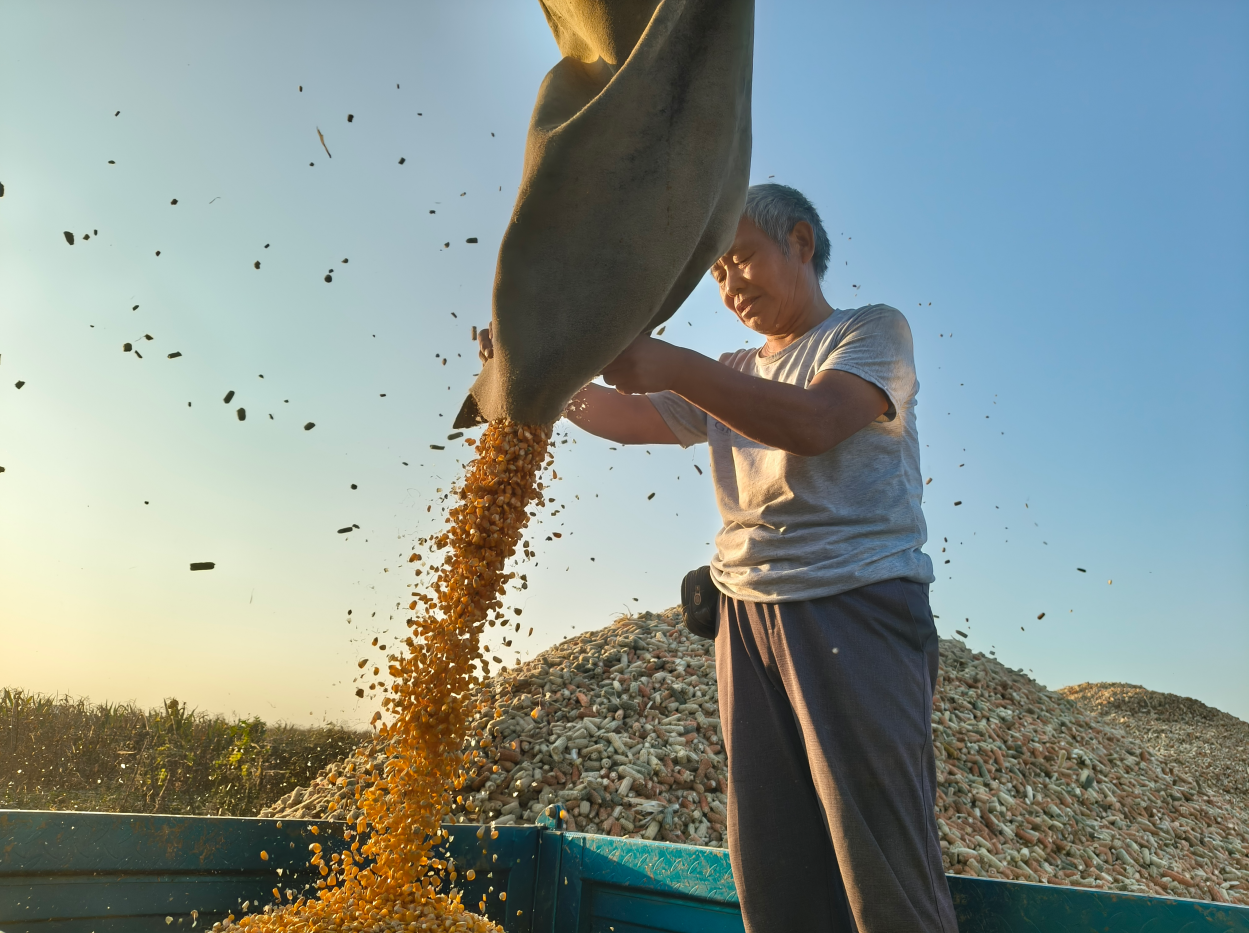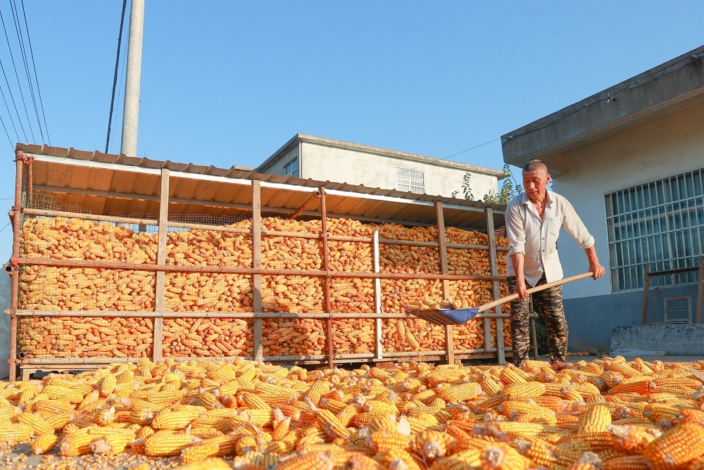 农户将玉米棒归仓。吴天元 摄
