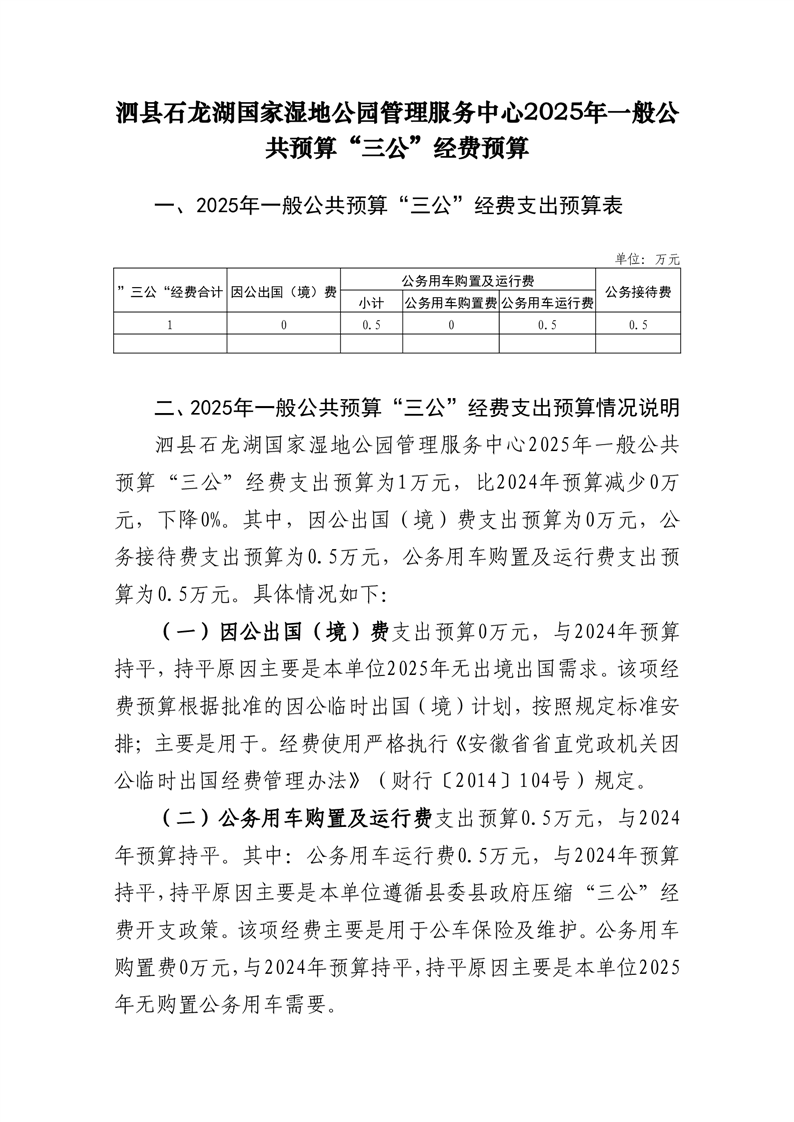 2025年泗县石龙湖国家湿地公园管理服务中心“三公”经费预算公开 |
