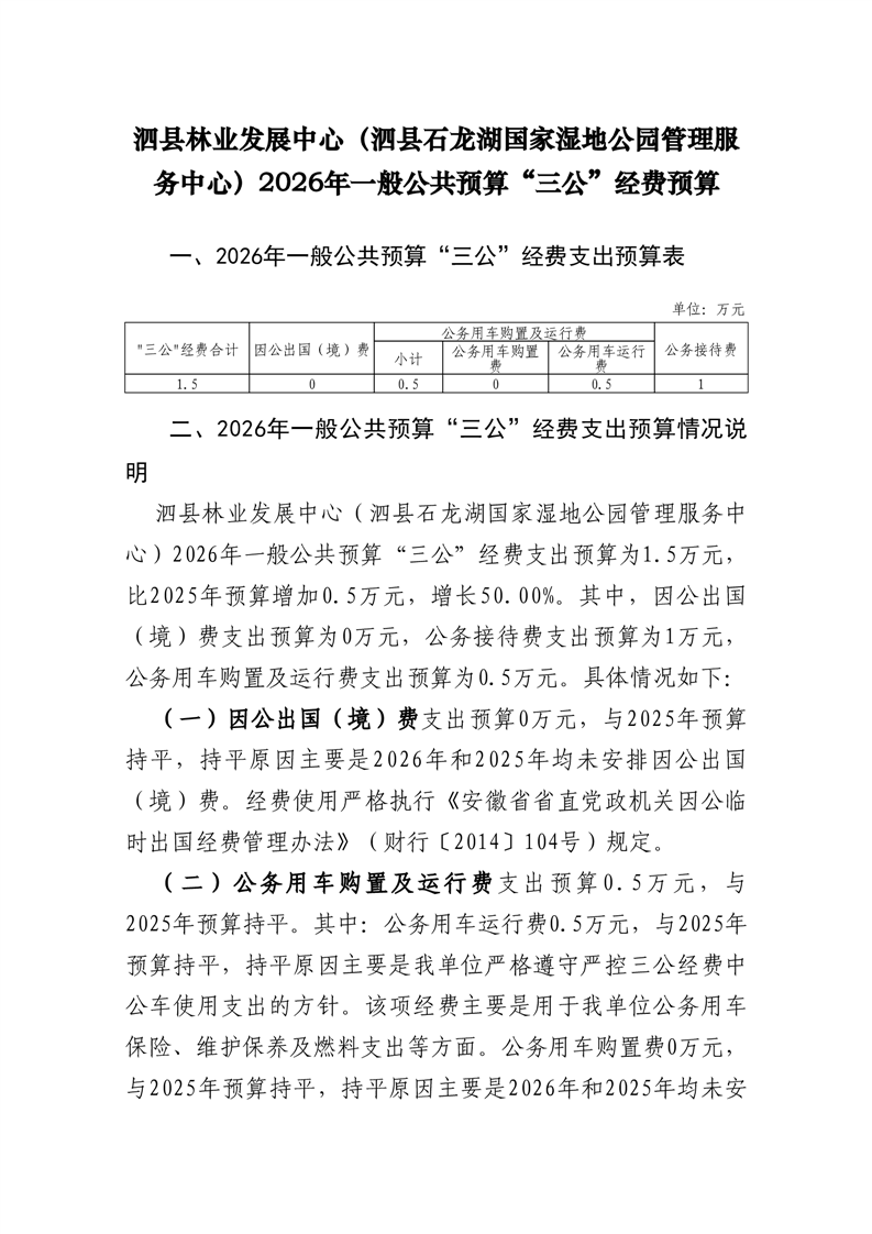 2026年泗县林业发展中心(泗县石龙湖国家湿地公园管理服务中心)三公经费预算公开 |
